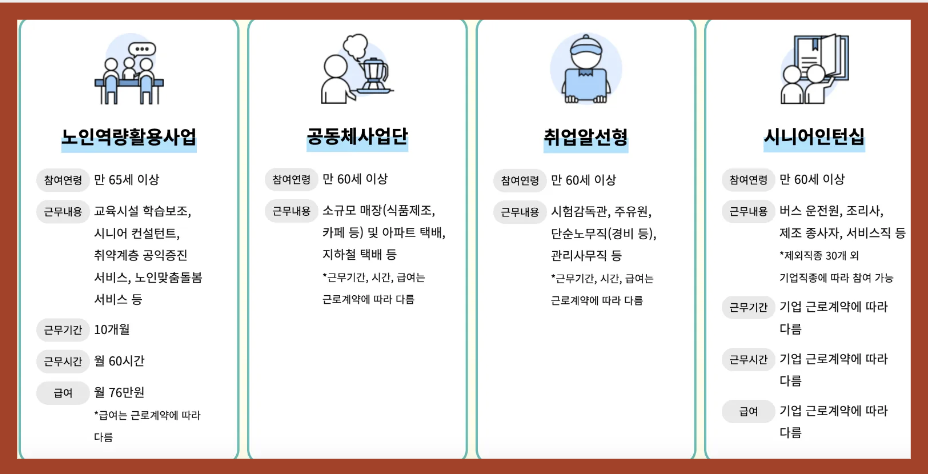 노인역량활용사업, 공동체사업단, 취업알선형, 시니어인턴쉽 등이 있습니다. 위 내용 확인해보시면 좋습니다.